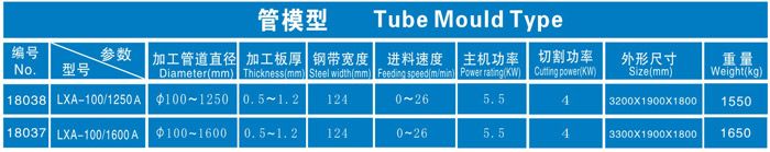 管模型 Tube Mould Type 參數(shù) 加工管道直徑(mm) 加工板厚(mm) 鋼帶寬度(mm) 進(jìn)料速度(m/min) 主機(jī)功率(KW) 切割功率(KW) 外形尺寸(mm) 重量(kg) 型號(hào) LXA-200/1250 ¢200∽1250 0.5∽1.2 124 0∽26 5.5 4 1900x1000x1200 1350 LXA-100/1250 ¢100∽1250 0.5∽1.2 124 0∽26 5.5 4 2940x1530x1900 1350 LXA-100/1600 ¢100∽1600 0.5∽1.2 124 0∽26 5.5 4 2940x1530x1900 1450 LXA-100/1200A ¢100∽1200 0.4∽0.8 124 0∽26 5.5 4 2940x1530x1900 1350 注:LXA-100/1200A可加工不銹鋼材料